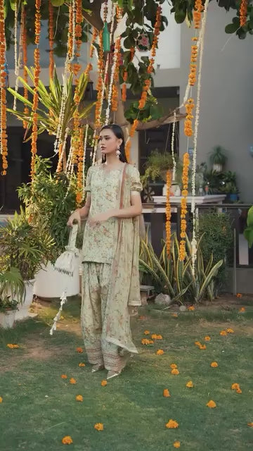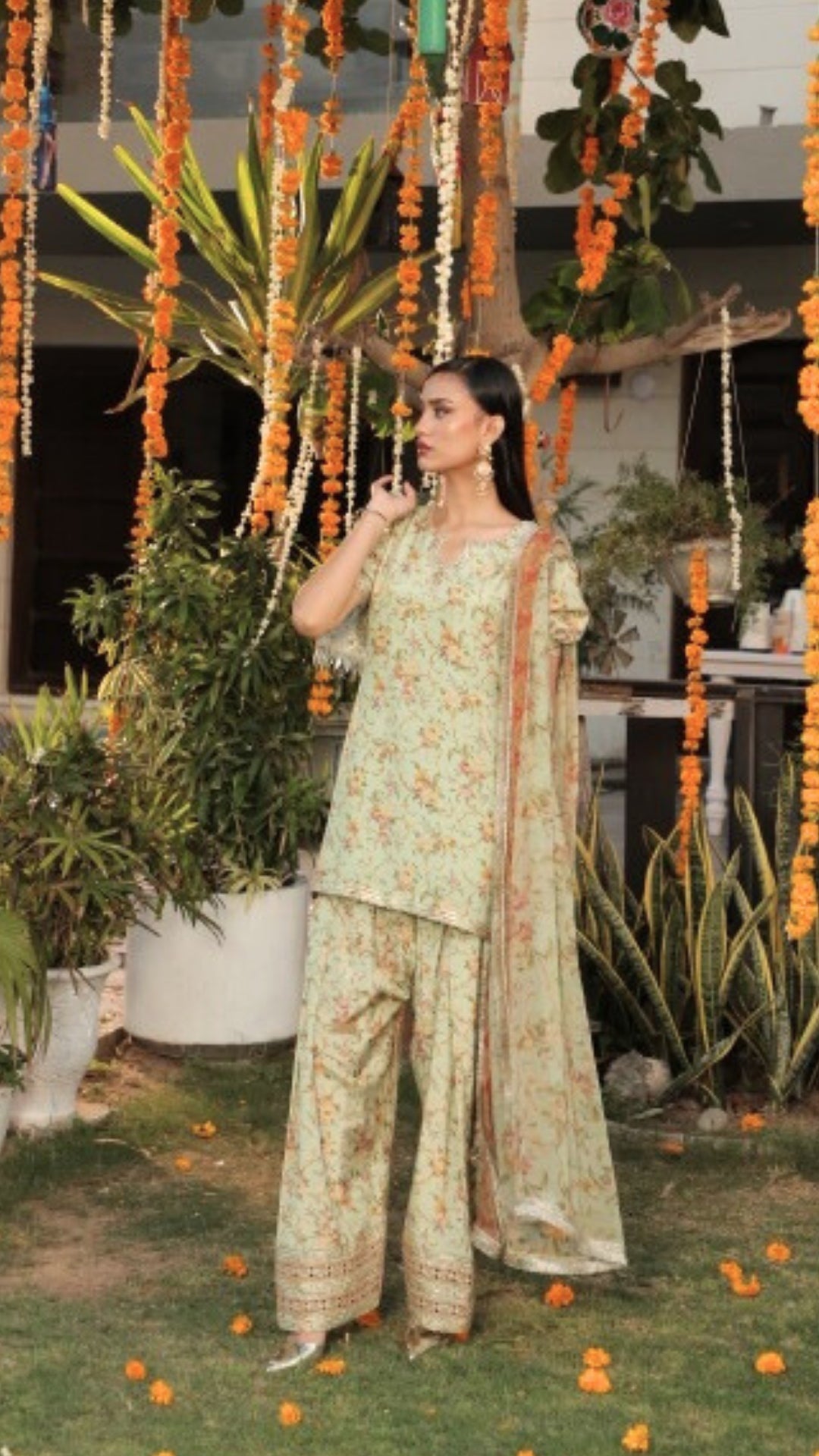 This exquisite piece features intricate handmade detailing on the neckline, with delicate laces adorning the Farshi shalwar, sleeves, and daman edges. The dupatta is beautifully finished with Kiran lace, adding a touch of elegance.
