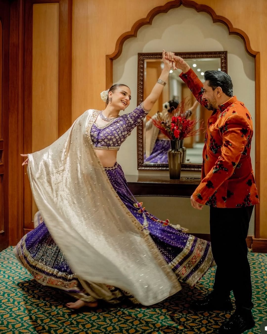 Hira Mani looks absolutely stunning in our “Rang Reza” collection, donning the beautiful “Zehra” ensemble. Crafted from delicate chikankari fabric, this exquisite lehnga choli is adorned with intricate handwork featuring Kundan, Gota Phool, and shisha — a true reflection of the opulence of the Mughal era. The addition of vibrant tassels brings a lively pop of color, making it the perfect choice for a mehndi celebration. The lehnga, embellished with detailed laces across 7 to 8 yards, is paired with a golden lamha tissue dupatta finished with lace edging. A matching potli bag is included as a complimentary accessory to complete the look.